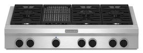 This cooktop features two of the industry's most powerful burners available (among leading brands) which provide precise, versatile control from 20,000 BTUs to 1,300 BTUs and in between on each burner, along with an Even-Heat ™ Gas Grill. KitchenAid ® commercial-style cooktops bring the tools of restaurant chefs into residential kitchens. Read More Detail...